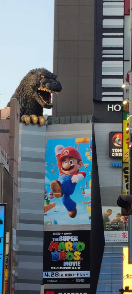 After checking out the shopping center, I made my way to see the famous Godzilla statue. On my way to it I came across the famous Shibuya Crossing and almost did not realize it at first. However, something told me to take a second and look at the crosswalks and I immediately knew where I was!  It was mesmerizing to see the number of people crossing at one time. I did take a picture of people crossing as well as when there were no people crossing. This was another place that made me enjoy Tokyo a little more. Eventually from here we came across the Godzilla statue and there was a perfectly placed Super Mario Bros. movie ad underneath it. I thought it was hilarious.