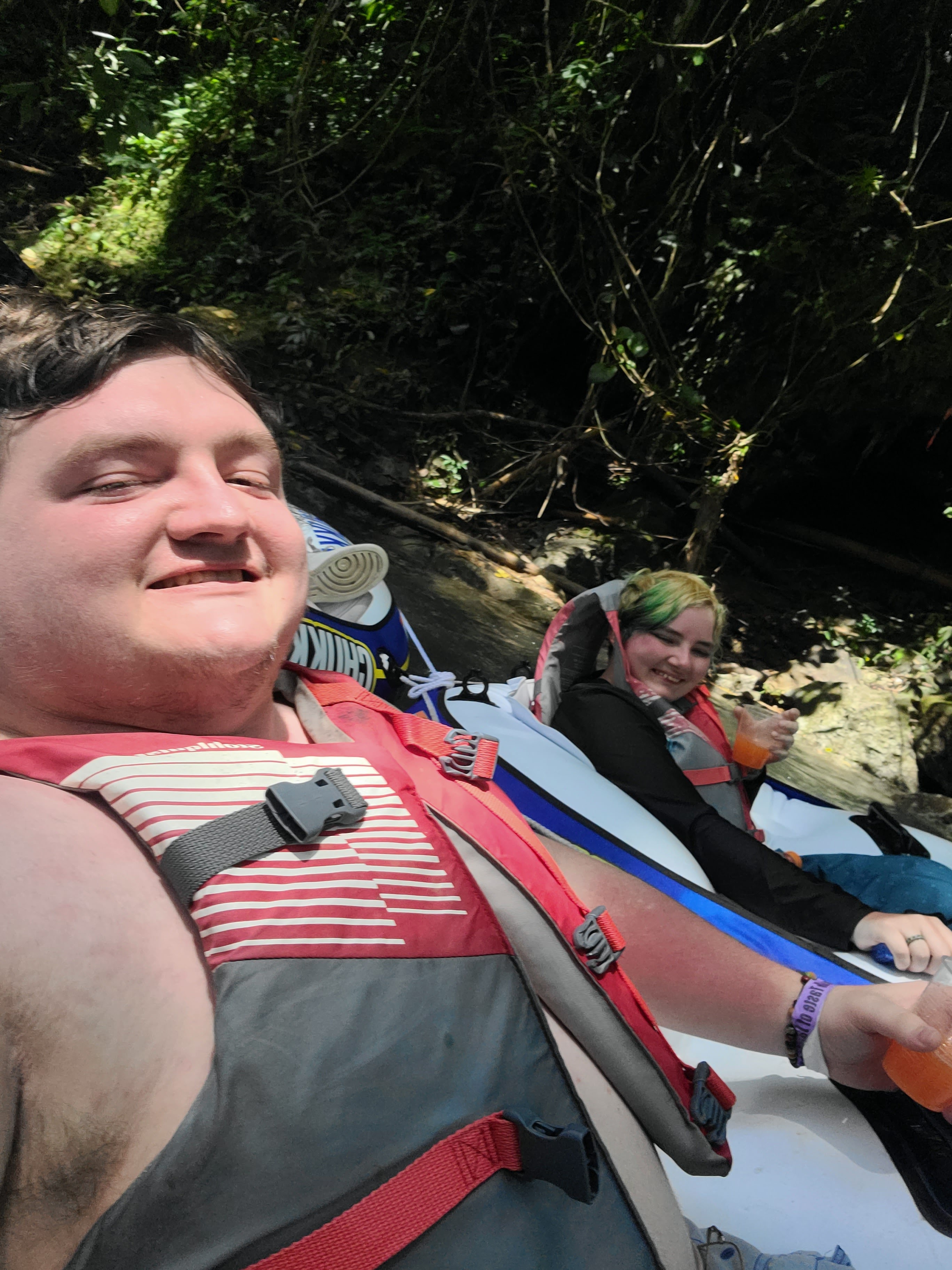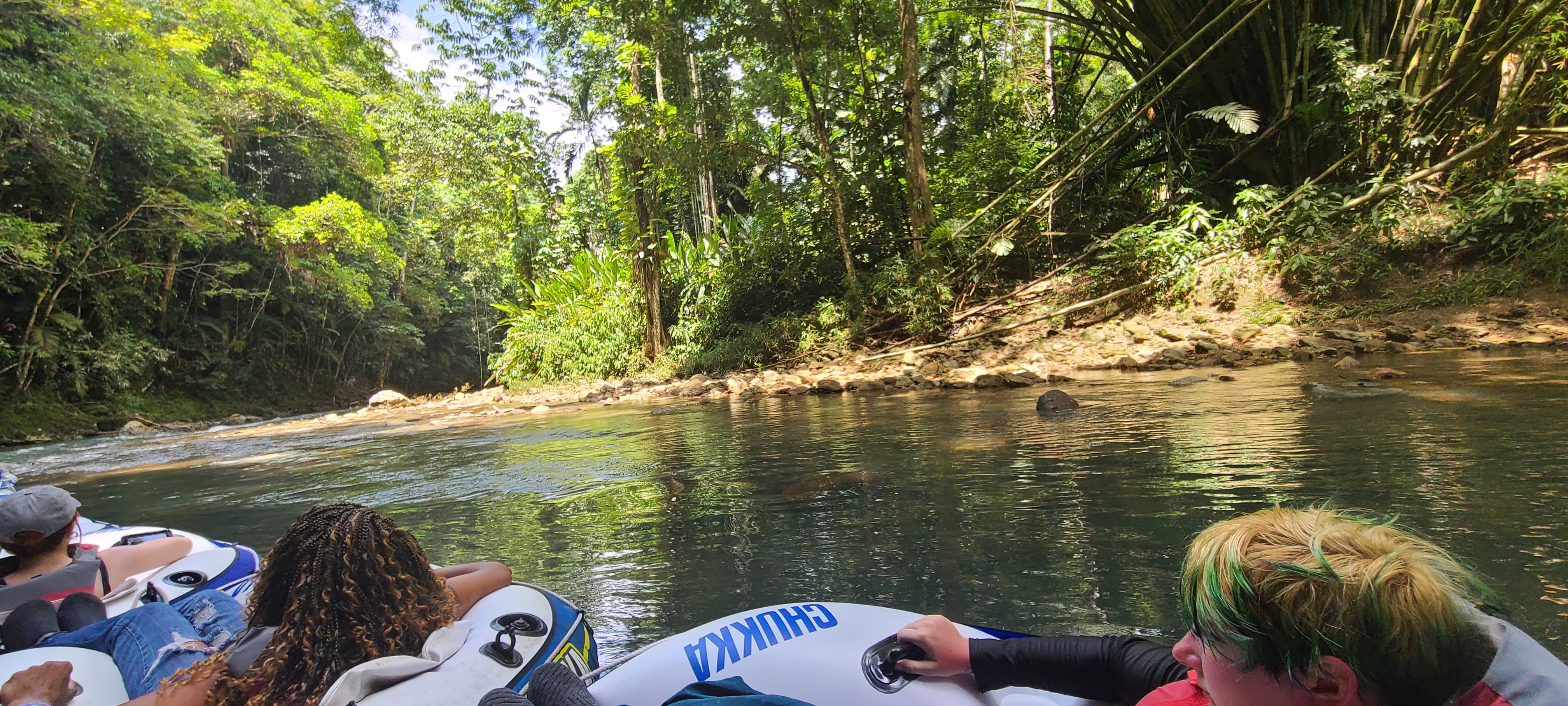 After doing the zipline course, we took the zipline gear off after hiking back to the pavilion, then we got ready to enjoy the river tubing.  River tubing was quite relaxing after the hike we did from our zipline adventure.  The water was cool and it was a nice ride, every now and then we’d have slight rapids to traverse in the tubes, but it was quite nice.  Eventually, the crewmen working the tubes passed out a tropical rum punch that was delicious!  The views were stunning, the rum was delicious, and at the end of the tubing, there was a rope we could use to jump into the river.  Riding back to the pavilion, songs were sang and it was a fun time.  When we made it back, we had Jerk Chicken for lunch that was very delicious, then it was time to head back to port.