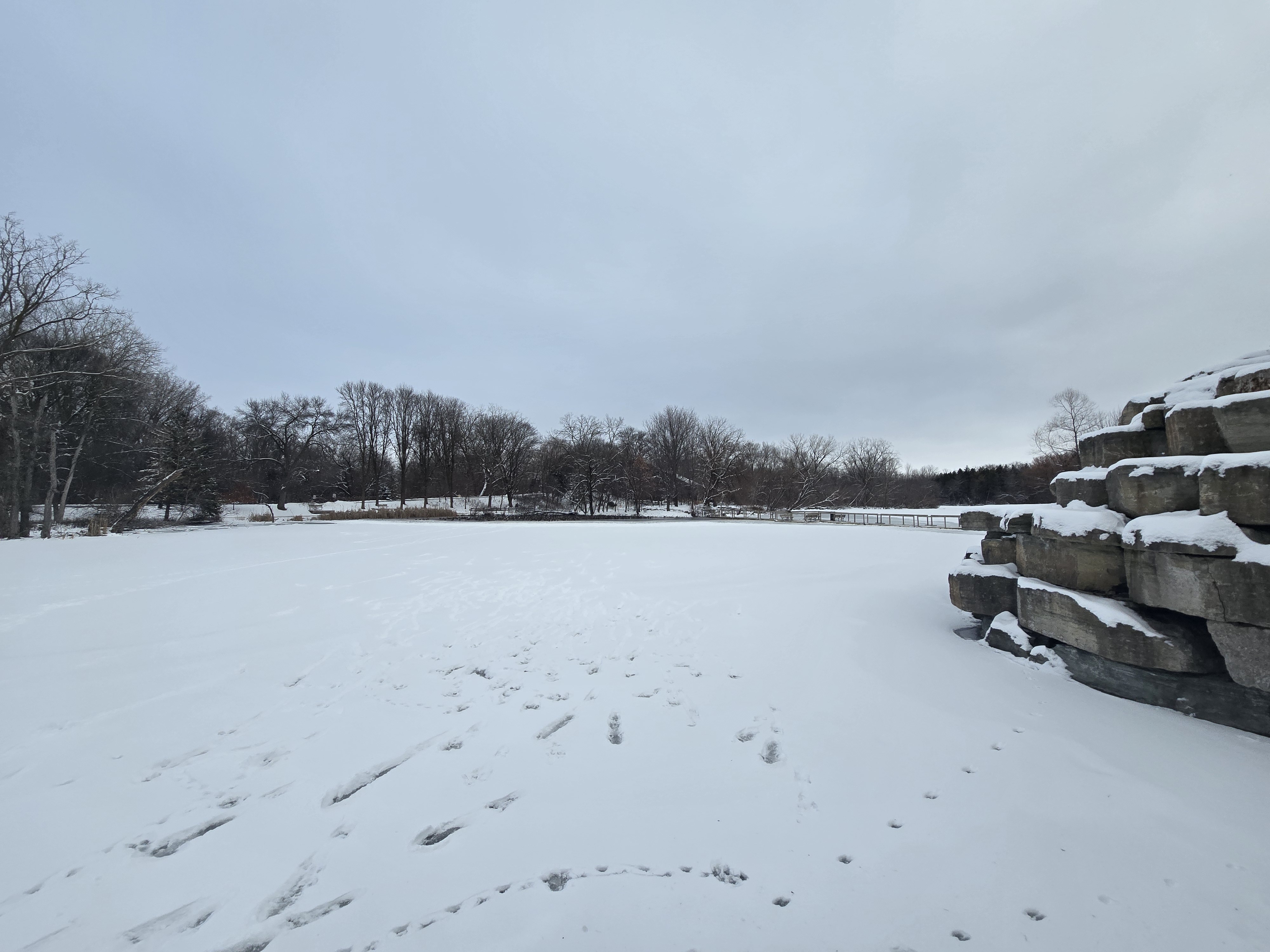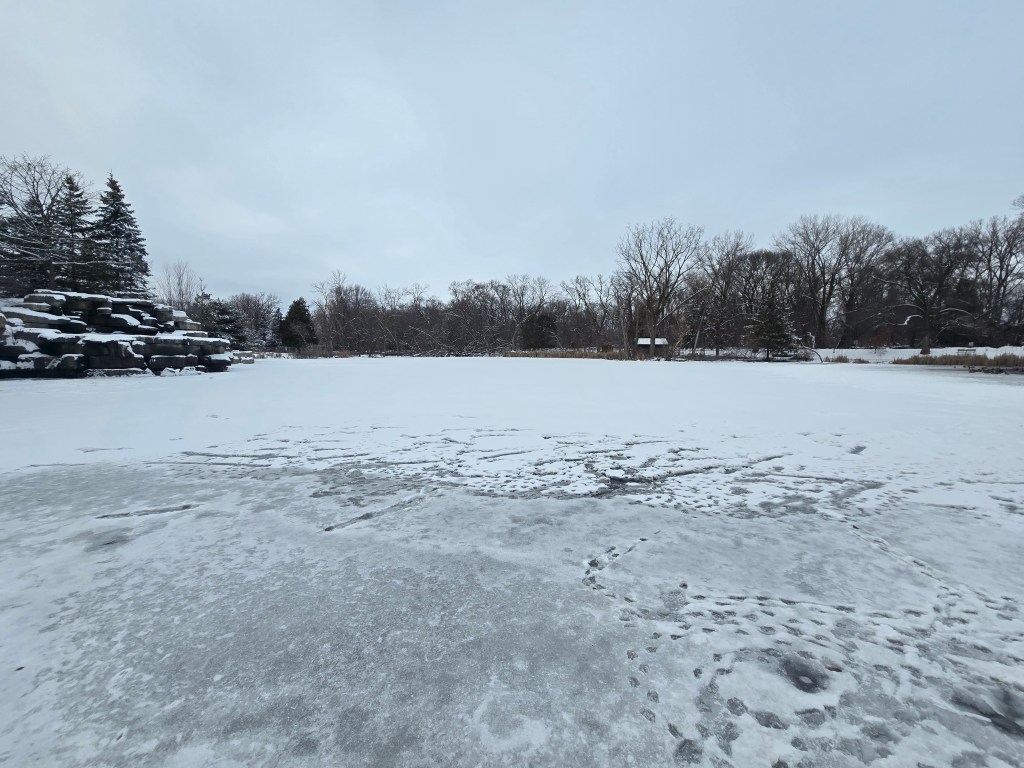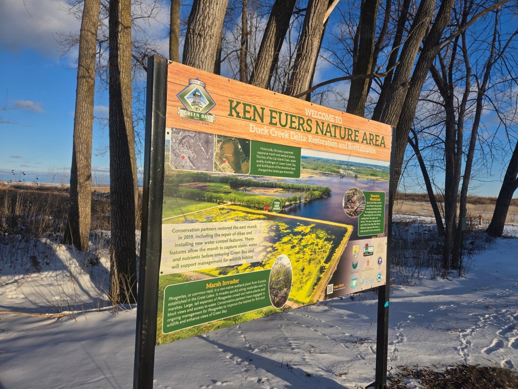 Waking up the next day took my partner and I a minute since we hadn’t gotten to our lodging until 4AM. My brother had booked an Airbnb about 30 minutes away and when we woke up, him, myself and my partner went to Ken Euers Nature Area. This spot has views of Green Bay and is bordered by Duck Creek and Fox River. At the time of our trip, there was snow and ice everywhere so it gave us a wonderful frozen view. Seeing the frozen Bay, snow surrounding us, and the wonderful views on our small hike was quite a sight to behold in this Winter Wonderland. We came across some animal tracks while walking around here.