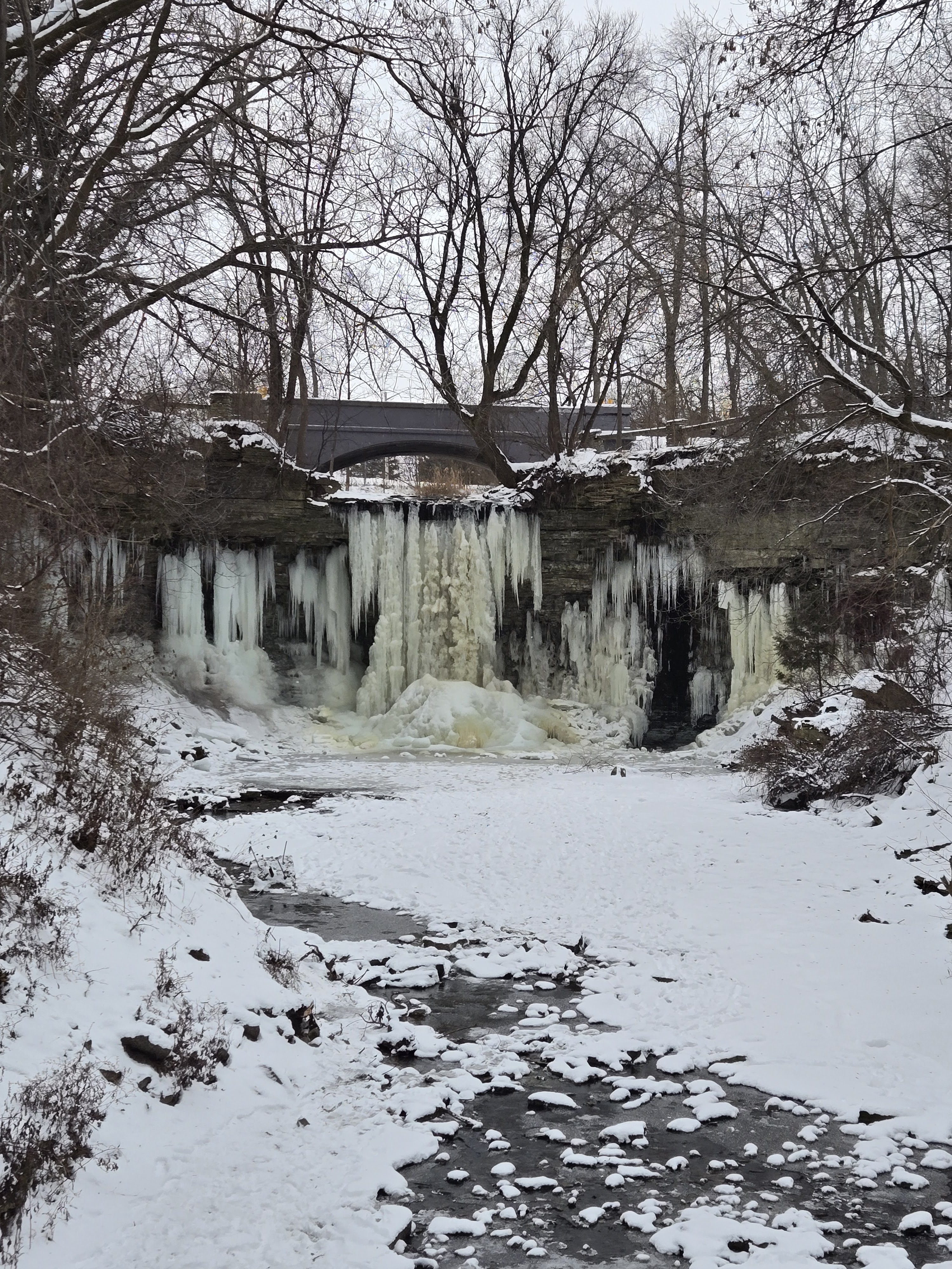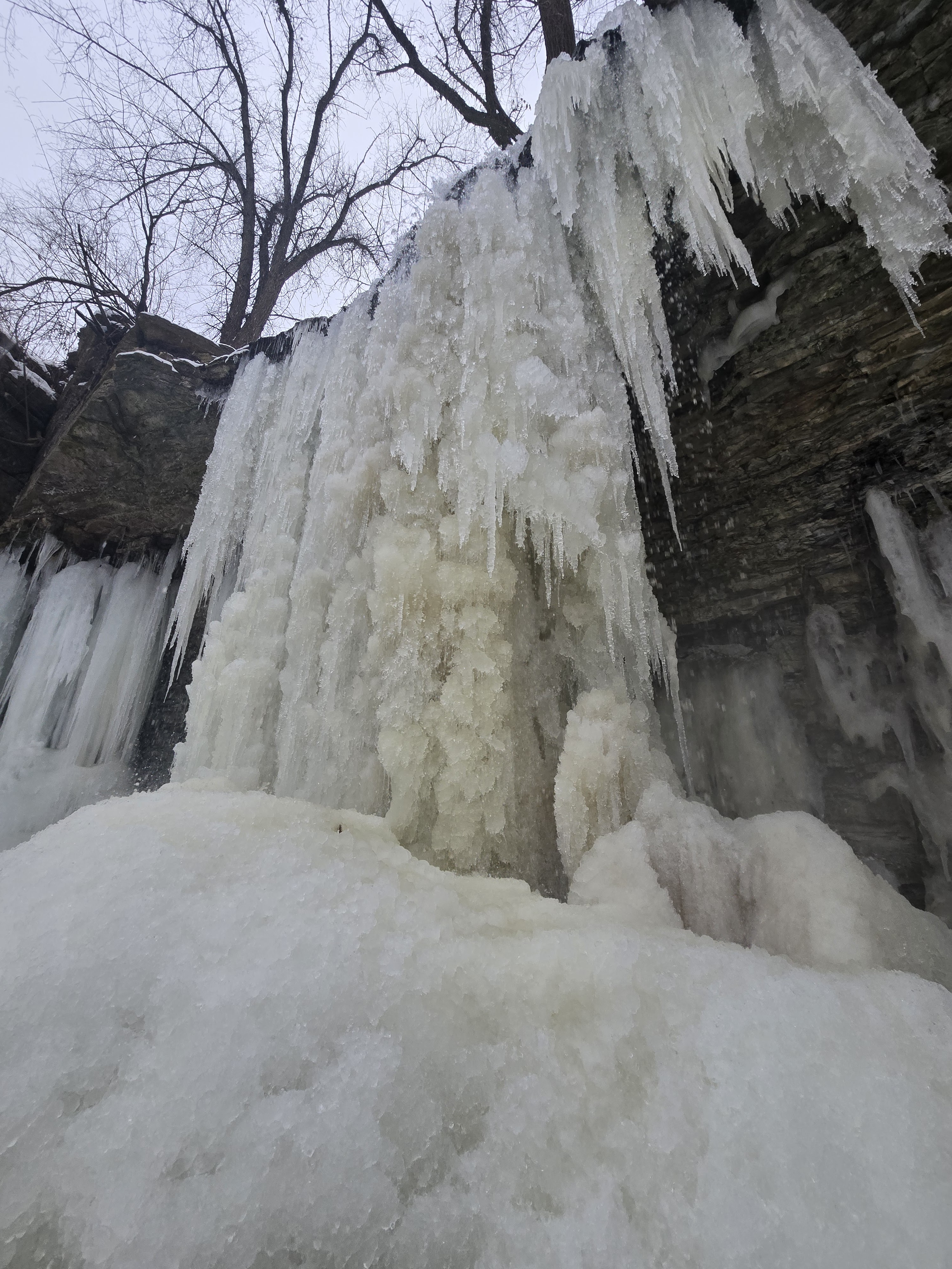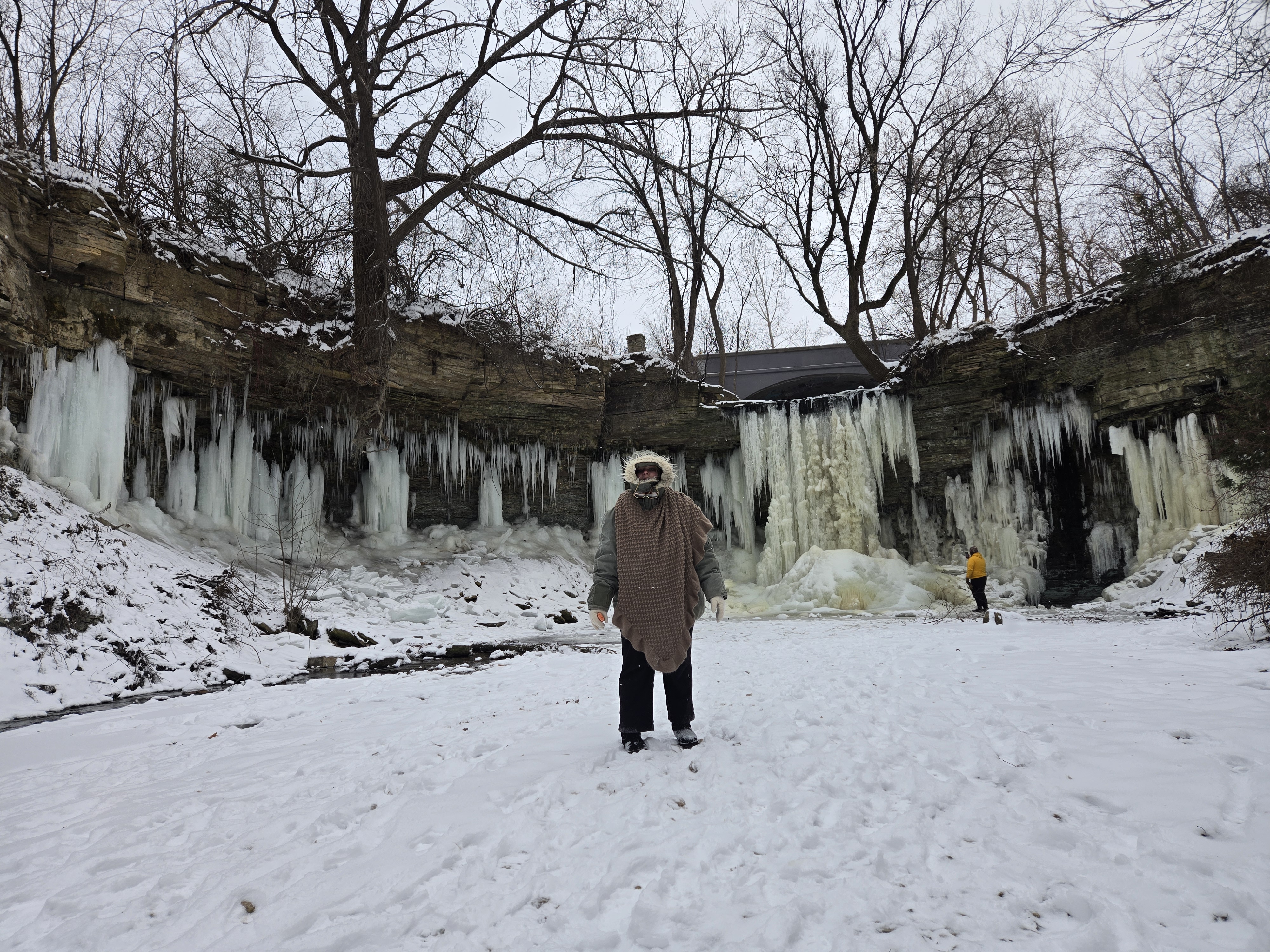 My brother, partner and I walked right up to the waterfall on the frozen stream in front of it. There was a little bit of water dripping so my brother and I stuck our hands in to feel the water. That was a fun mistake of ours, but well worth it and I enjoyed every second of that burning cold on my hands