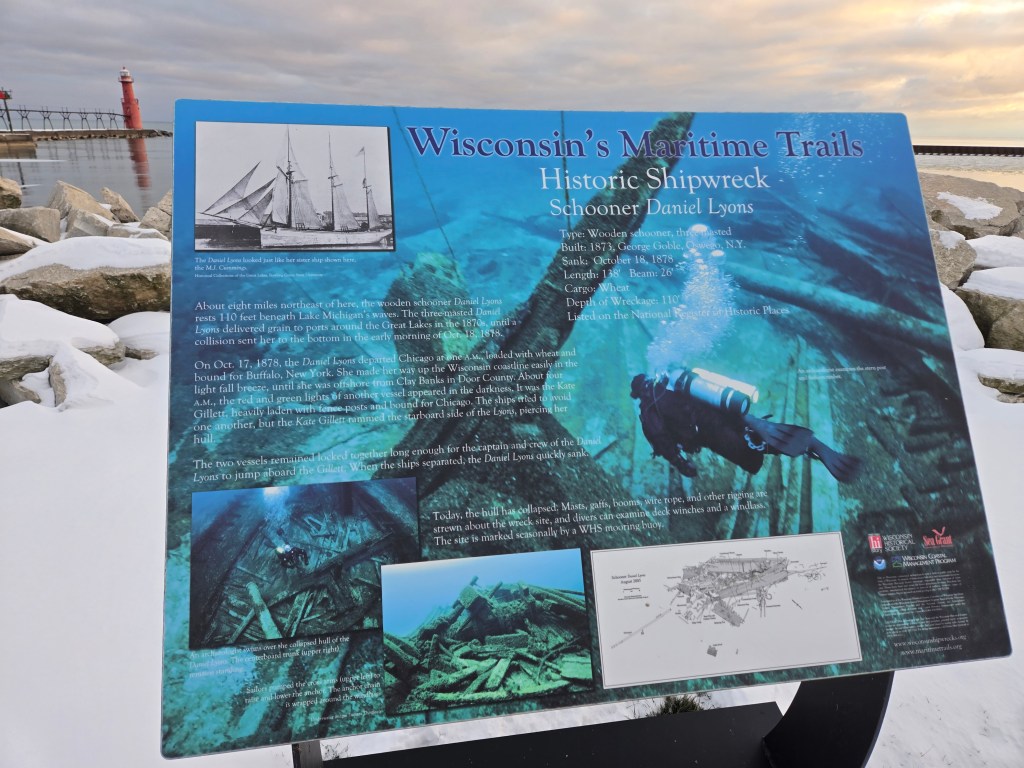 We decided to take some pictures of the sunset over the town behind us since it was gorgeous! Upon arriving at the lighthouse, there is a placard sharing how this is a good area to go scuba diving, therefore I will be coming back here to get a look underwater in Lake Michigan!