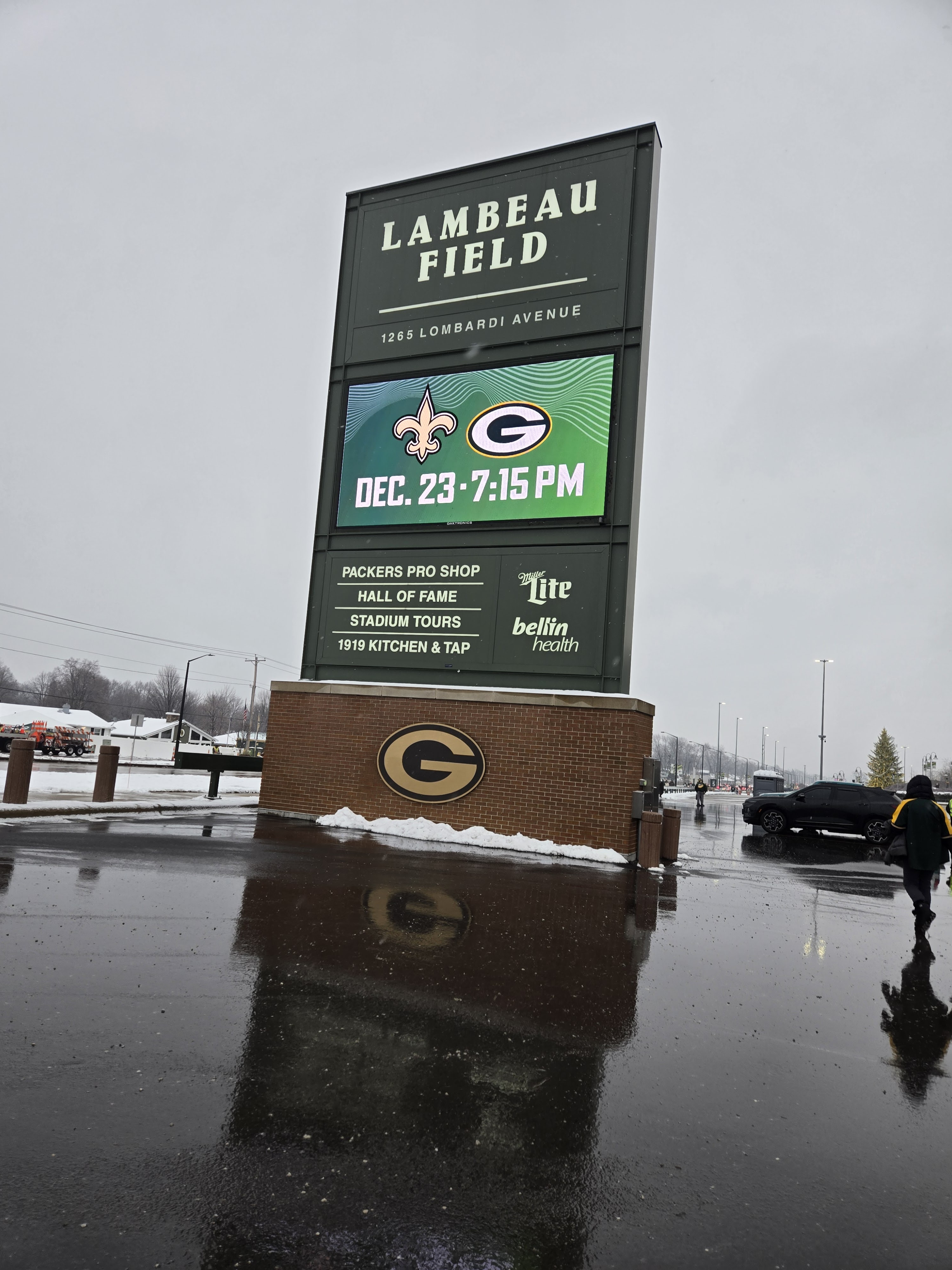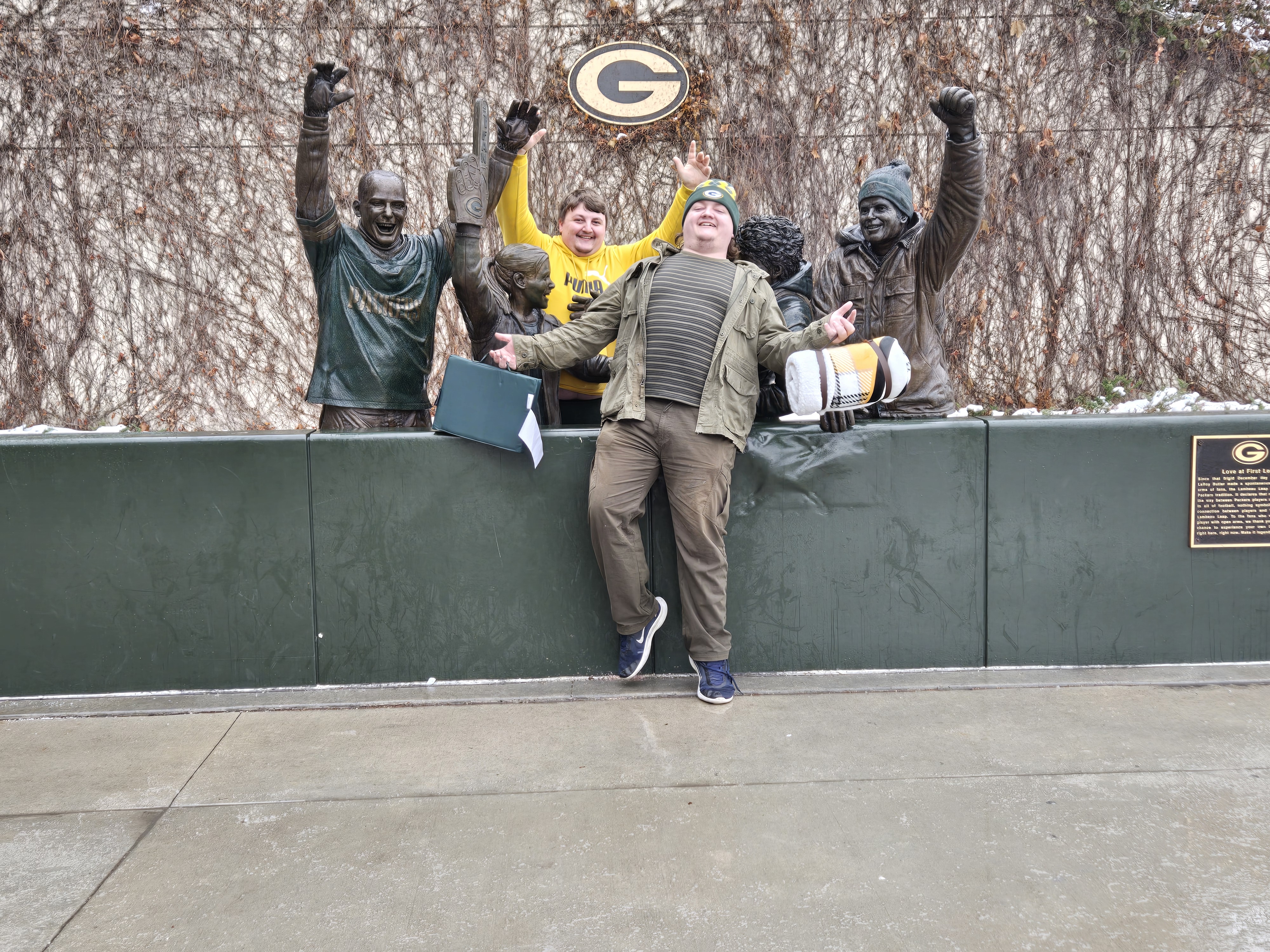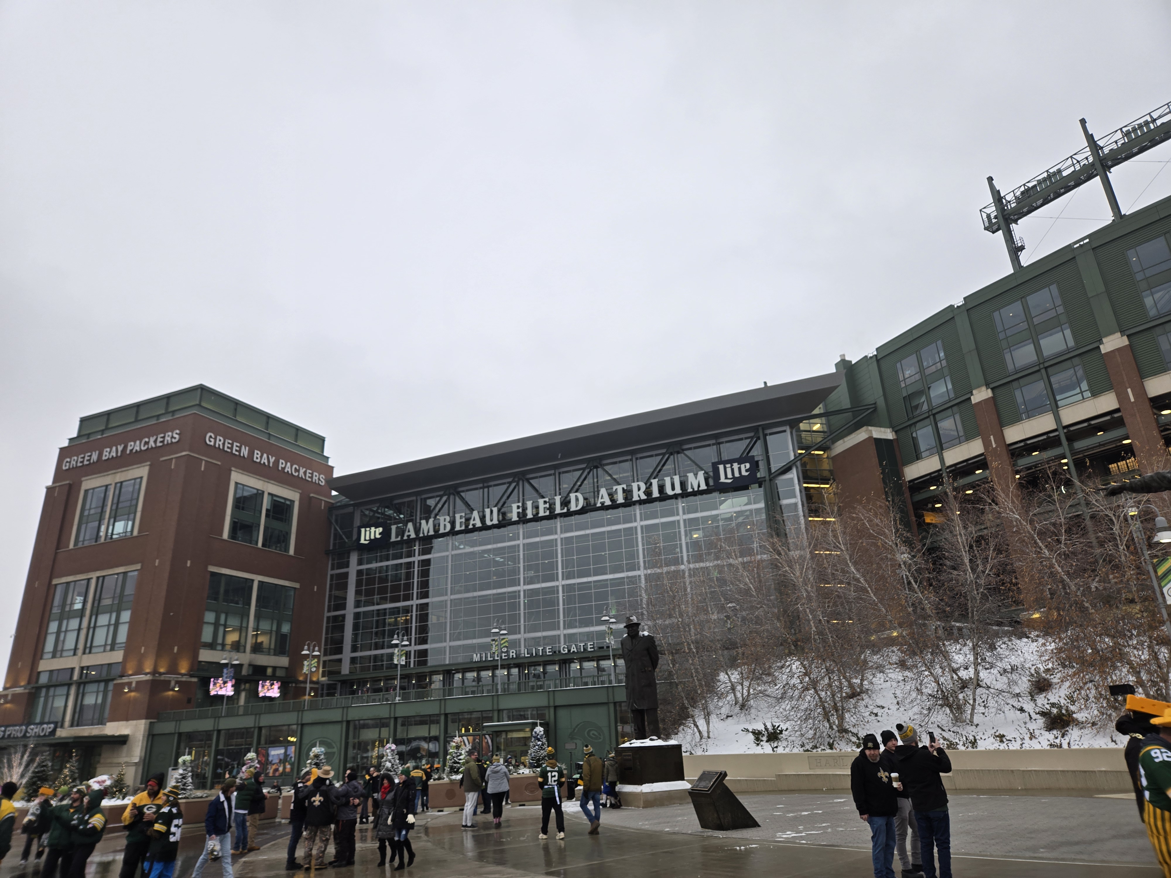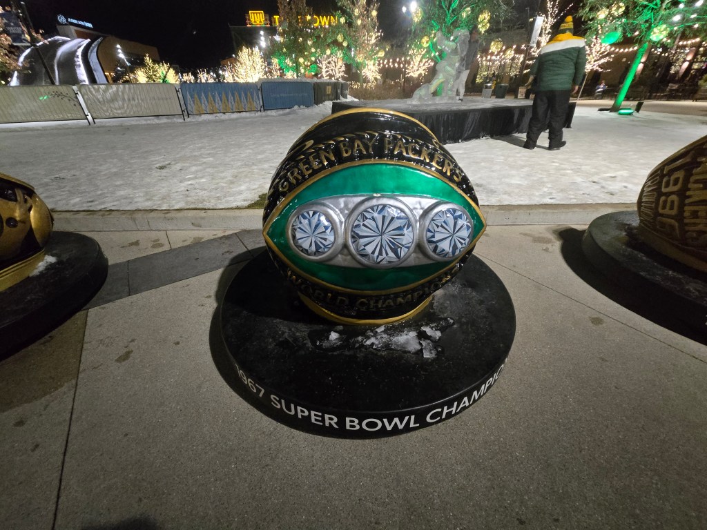 After eating breakfast, we went to Titletown, which is right across the street from Lambeau Field. In the winter it has an ice skating rink and hill for snow tubing. In the area there are also restaurants to eat at, and as I was visiting I could see plans for retail and commercial spots coming up. It is a nice area with many things to do, after we checked the place out we stopped at Leaps & Bounds for a drink to warm us up before going in for the game. I got myself a dark chocolate liquor hot chocolate which was quite delightful after wandering in the snow. We also took a walk around Lambeau Field before entering the fates for the game.