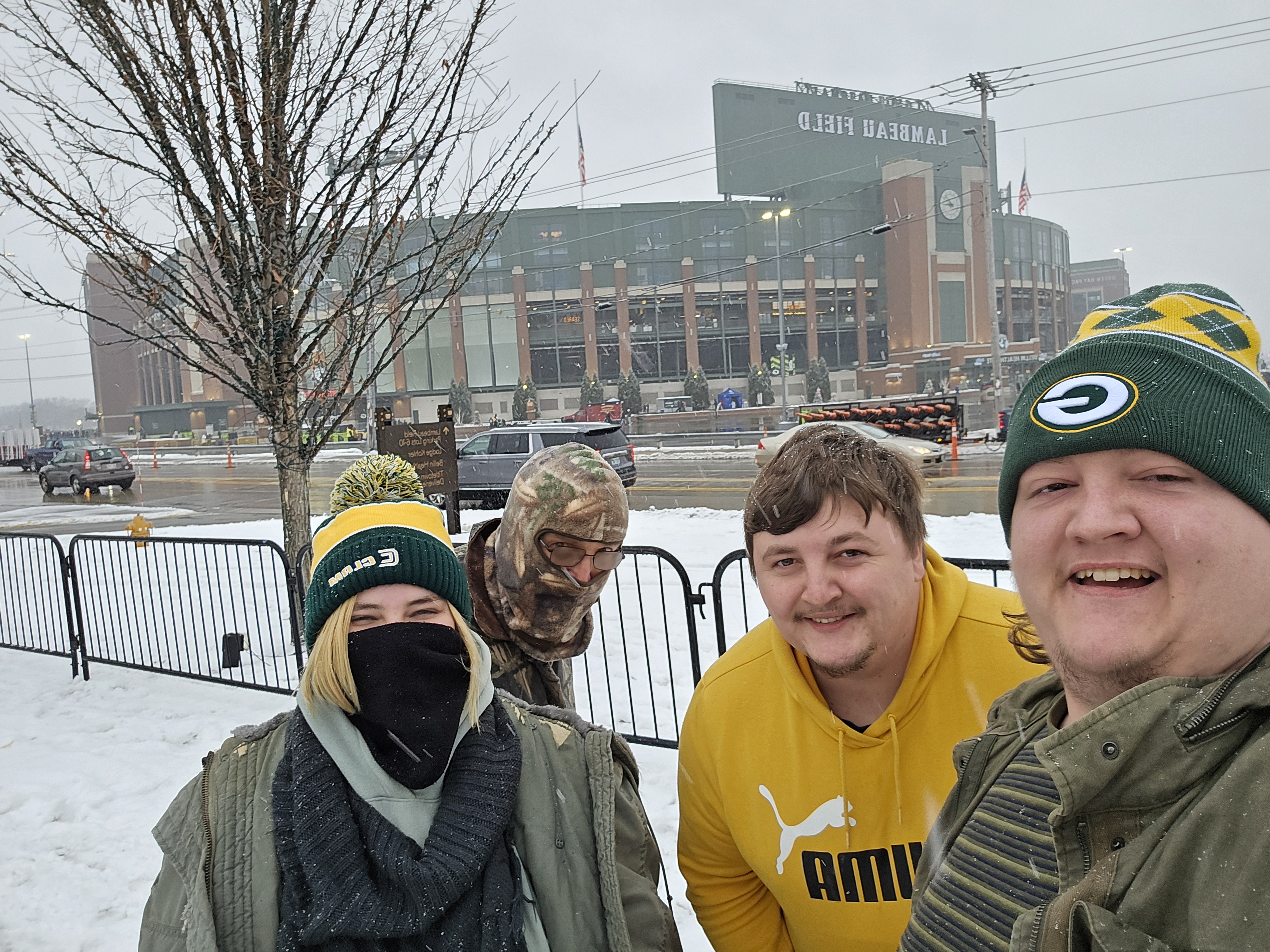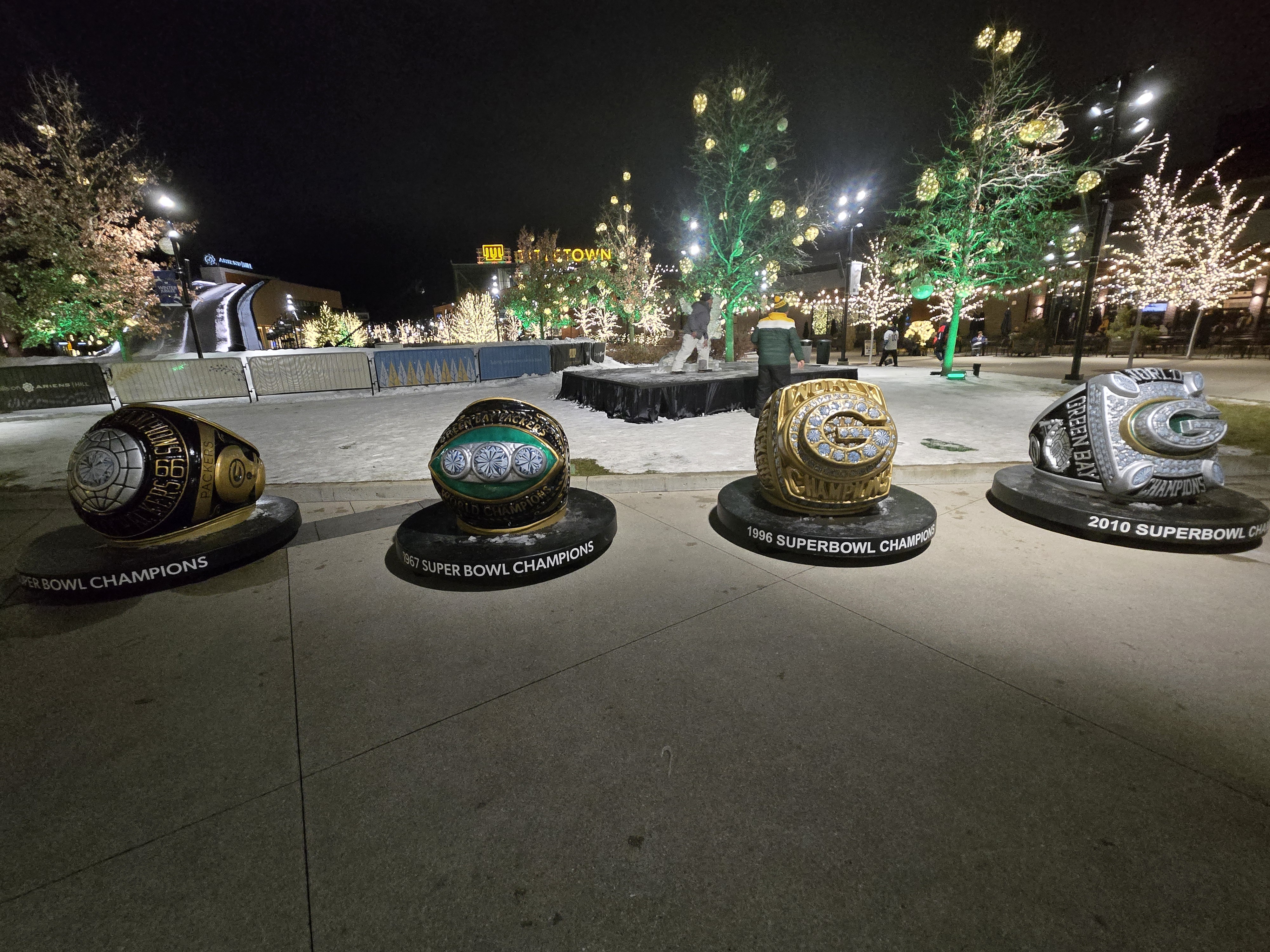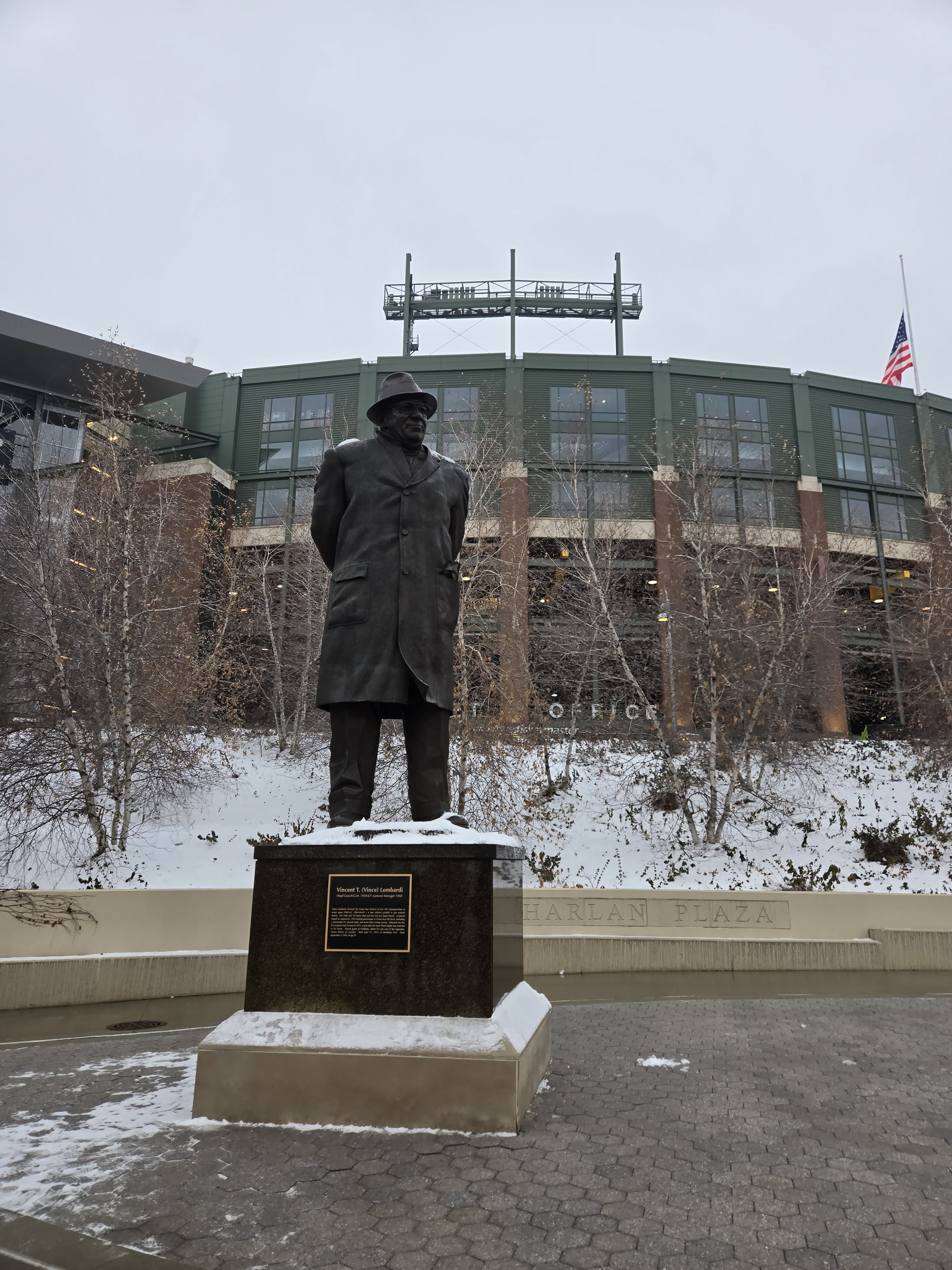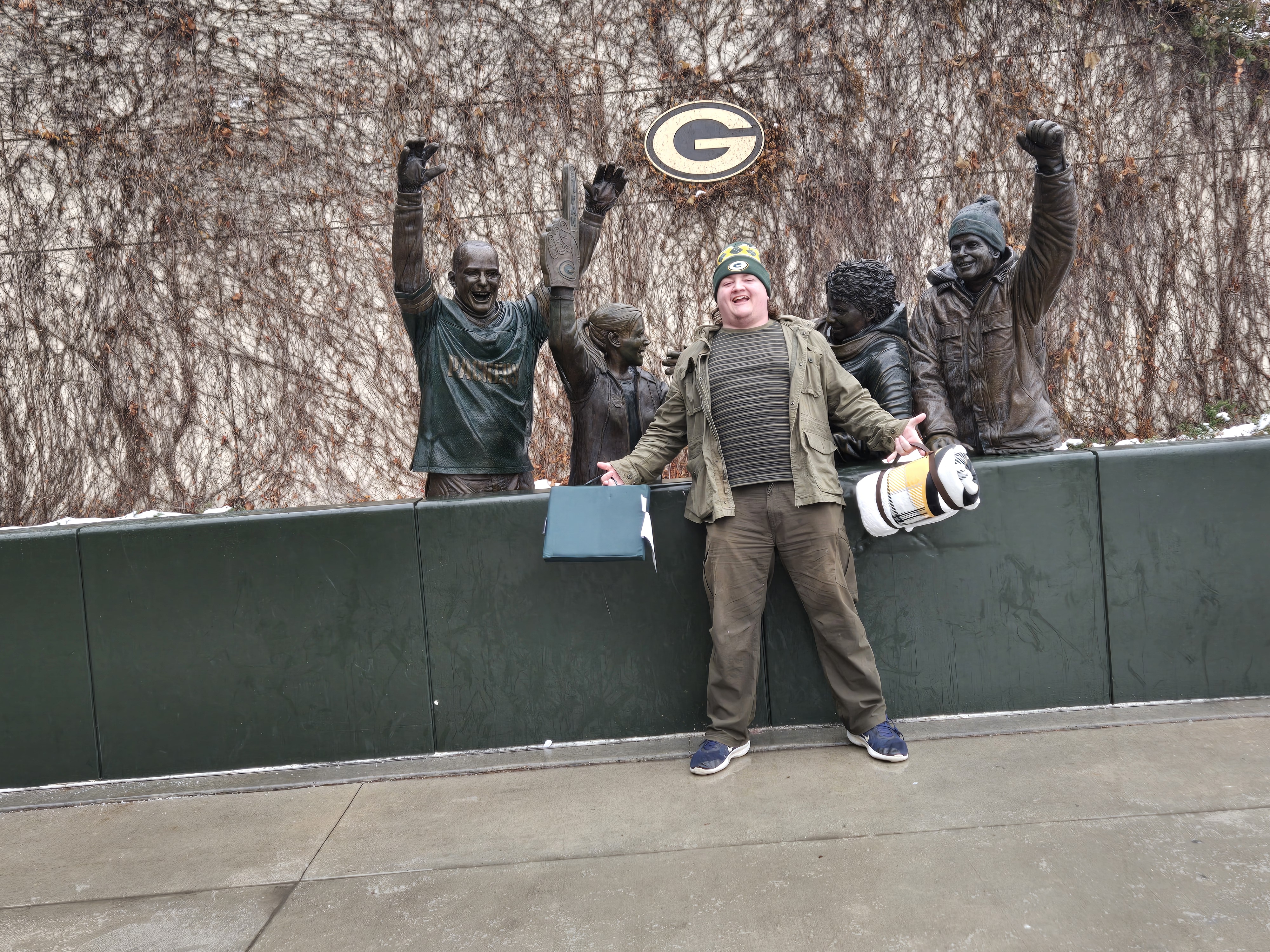After eating breakfast, we went to Titletown, which is right across the street from Lambeau Field. In the winter it has an ice skating rink and hill for snow tubing. In the area there are also restaurants to eat at, and as I was visiting I could see plans for retail and commercial spots coming up. It is a nice area with many things to do, after we checked the place out we stopped at Leaps & Bounds for a drink to warm us up before going in for the game. I got myself a dark chocolate liquor hot chocolate which was quite delightful after wandering in the snow. We also took a walk around Lambeau Field before entering the fates for the game.