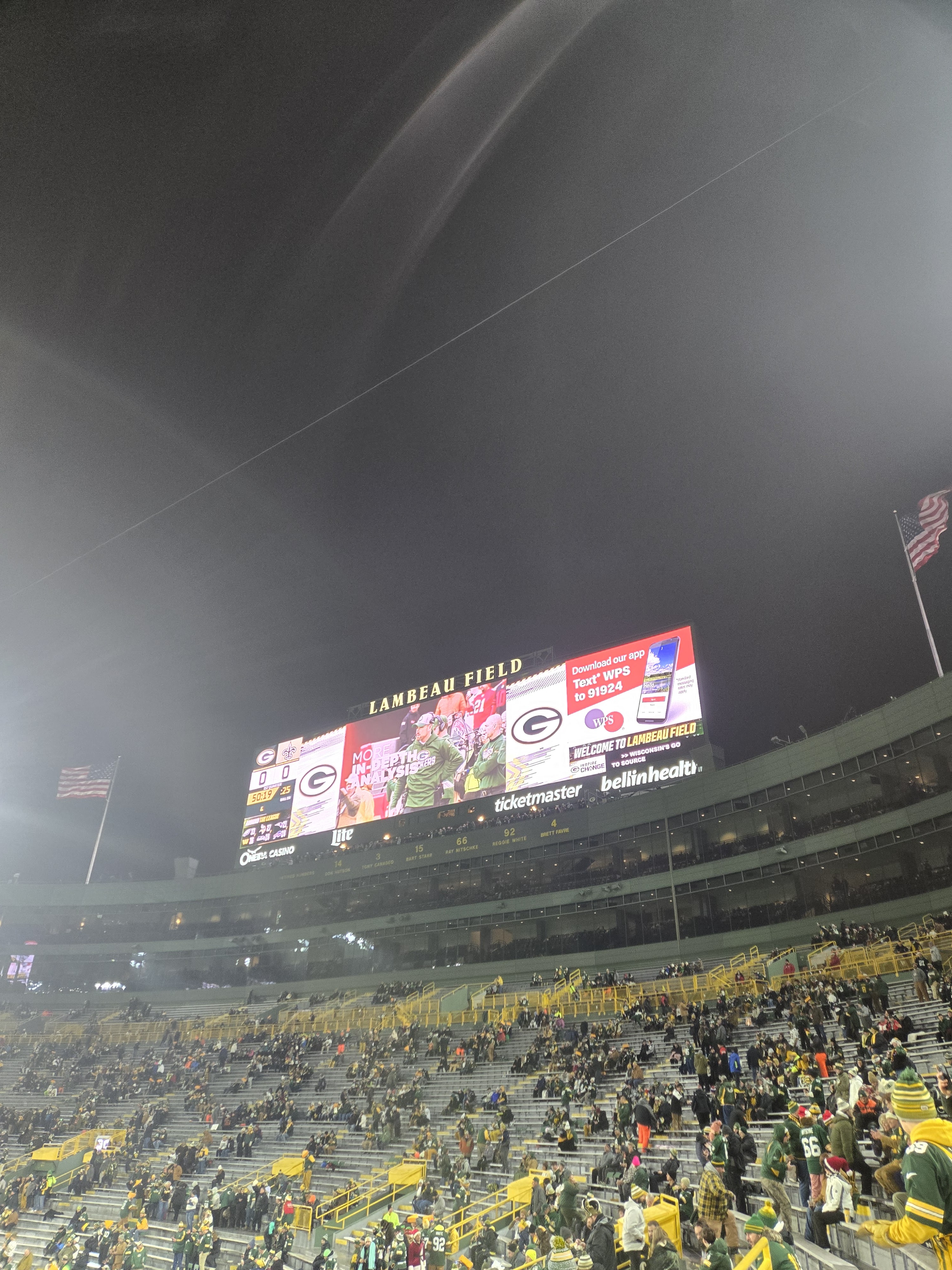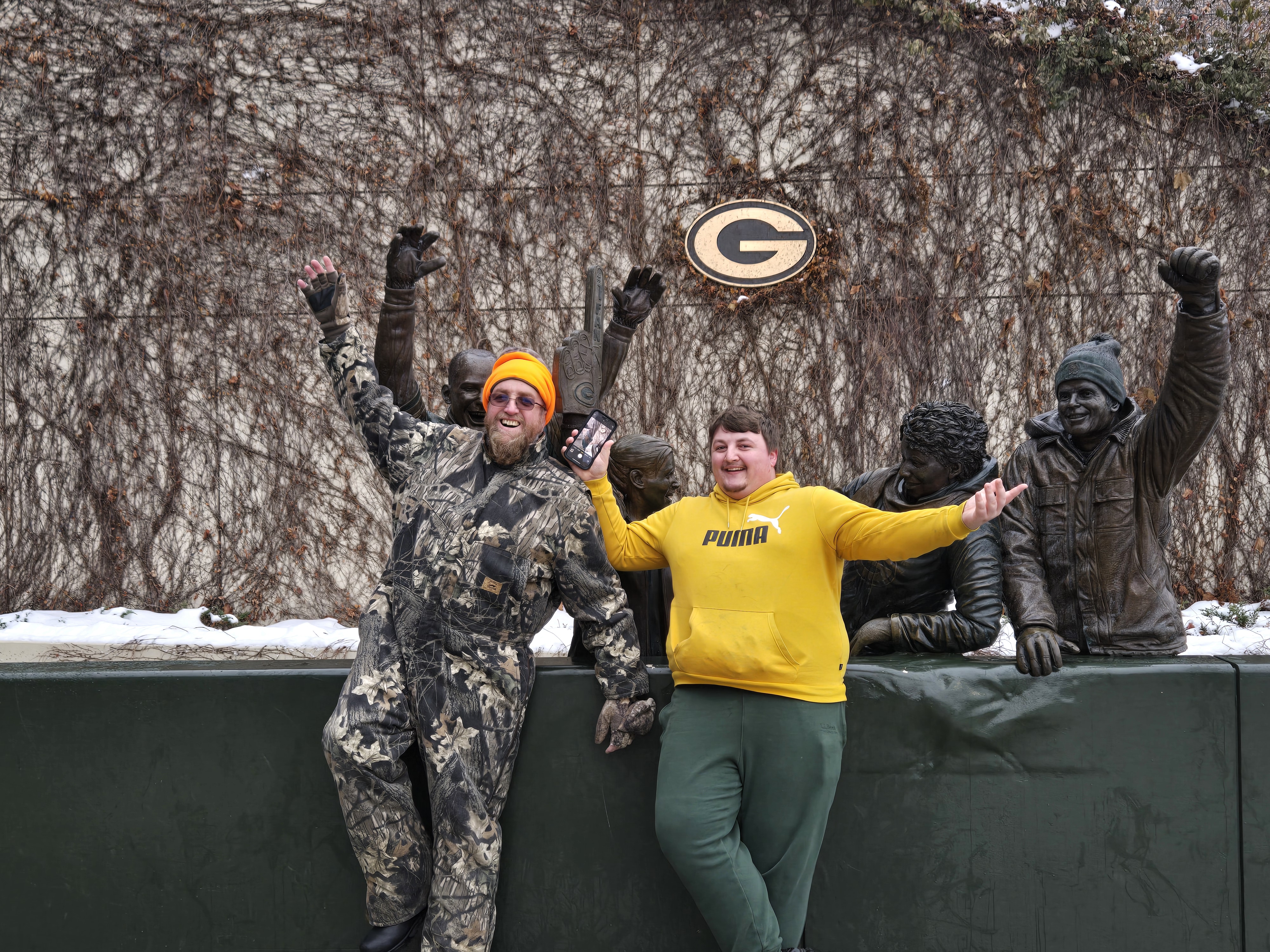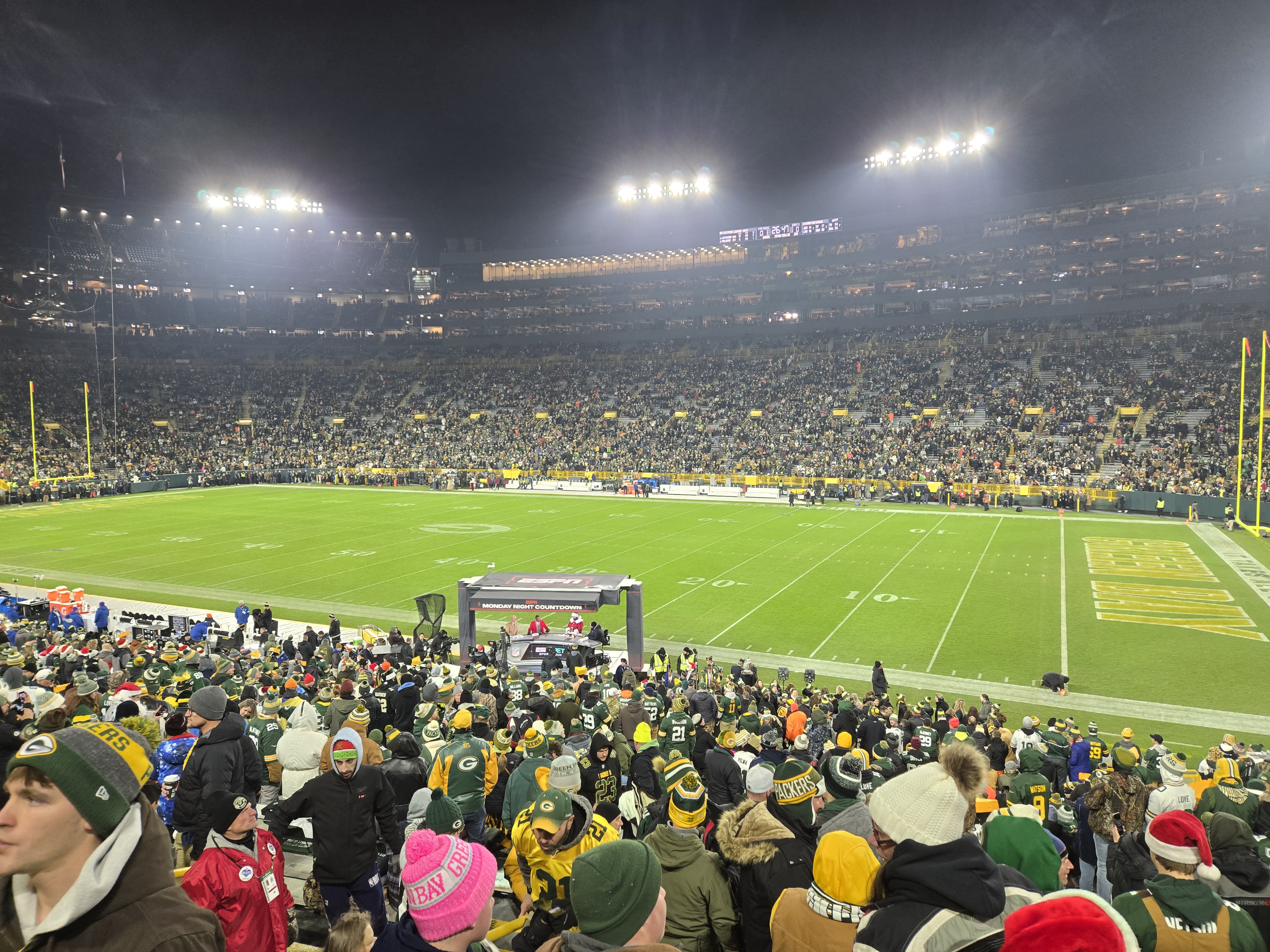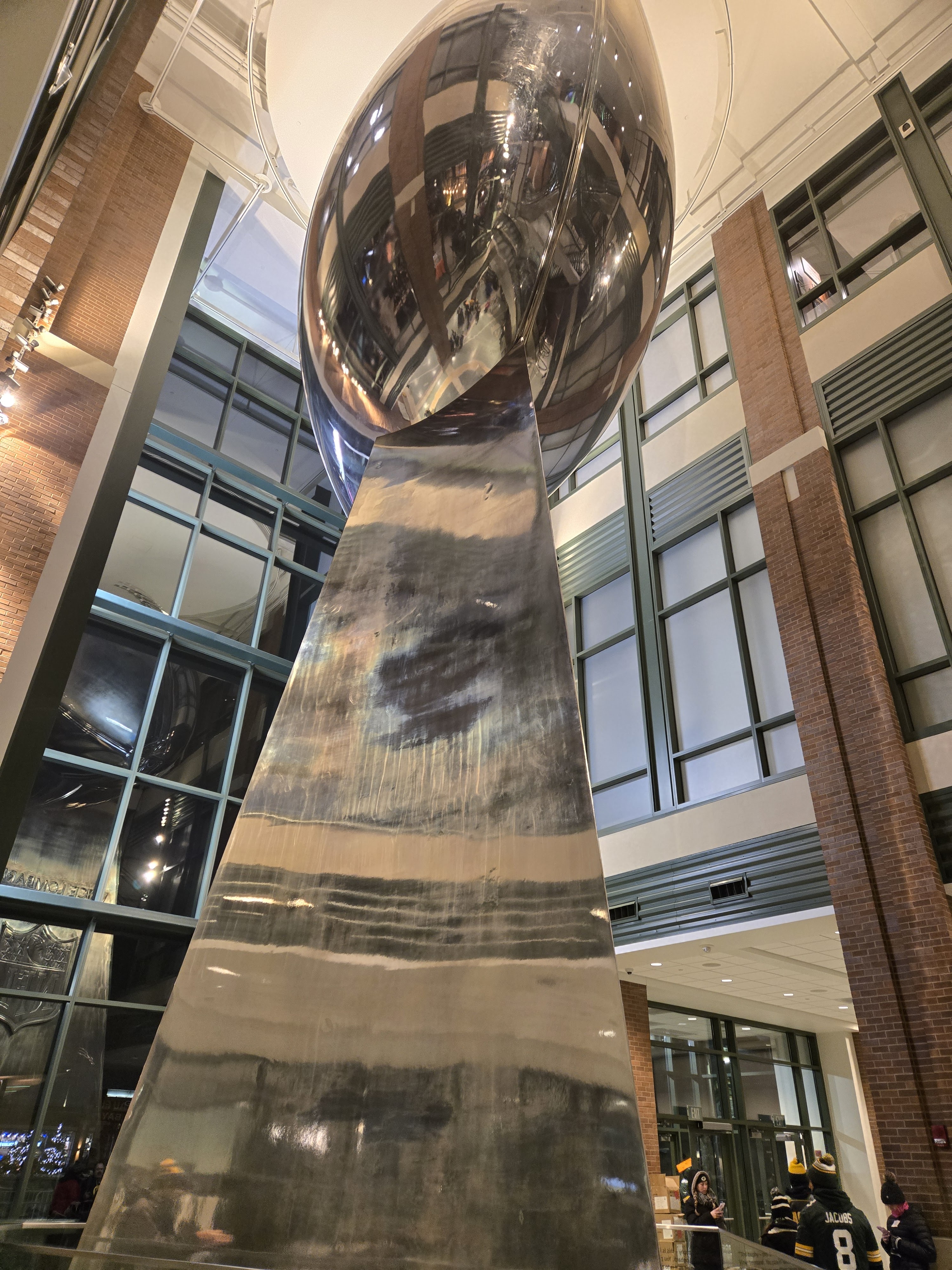 After eating breakfast, we went to Titletown, which is right across the street from Lambeau Field. In the winter it has an ice skating rink and hill for snow tubing. In the area there are also restaurants to eat at, and as I was visiting I could see plans for retail and commercial spots coming up. It is a nice area with many things to do, after we checked the place out we stopped at Leaps & Bounds for a drink to warm us up before going in for the game. I got myself a dark chocolate liquor hot chocolate which was quite delightful after wandering in the snow. We also took a walk around Lambeau Field before entering the fates for the game.